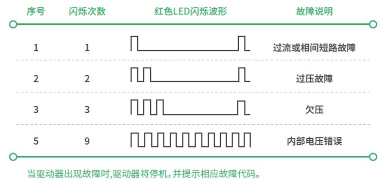 绿色LED为电源指示灯,当驱动器接通电源时,该LED常亮;当驱动器切断电源时,该LED熄灭。红色LED为故障指示灯,当出现故障时,该指示灯闪烁完对应的次数后灭2秒钟为周期循环闪烁;当故障被用户清除时,红色LED常灭。红色LED在周期内闪烁次数代表不同的故障信息,具体关系如下表所示: