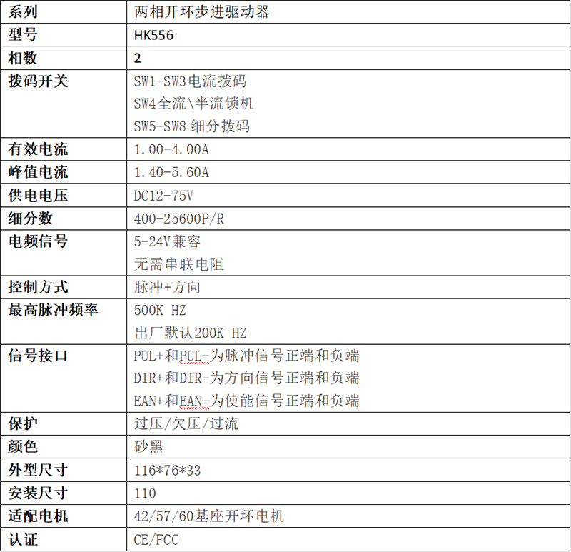 数字式两相步进驱动器,采用最新32位DSP数字处理技术,驱动器控制算法采用先进的变电流技术和先进的变频技术,驱动器发热小,电机振动小,运行平稳。用户可以设置200~51200内的任意细分以及额定电流内的任意电流值,能够满足大多数场合的应用需要。由于采用内置微细分技术,即使在低细分的条件下,也能够达到高细分的效果,低中高速运行都很平稳,噪音超小。驱动器内部集成了参数上电自动整定功能,能够针对不同电机自动生成最优运行参数,最大限度发挥电机的性能。